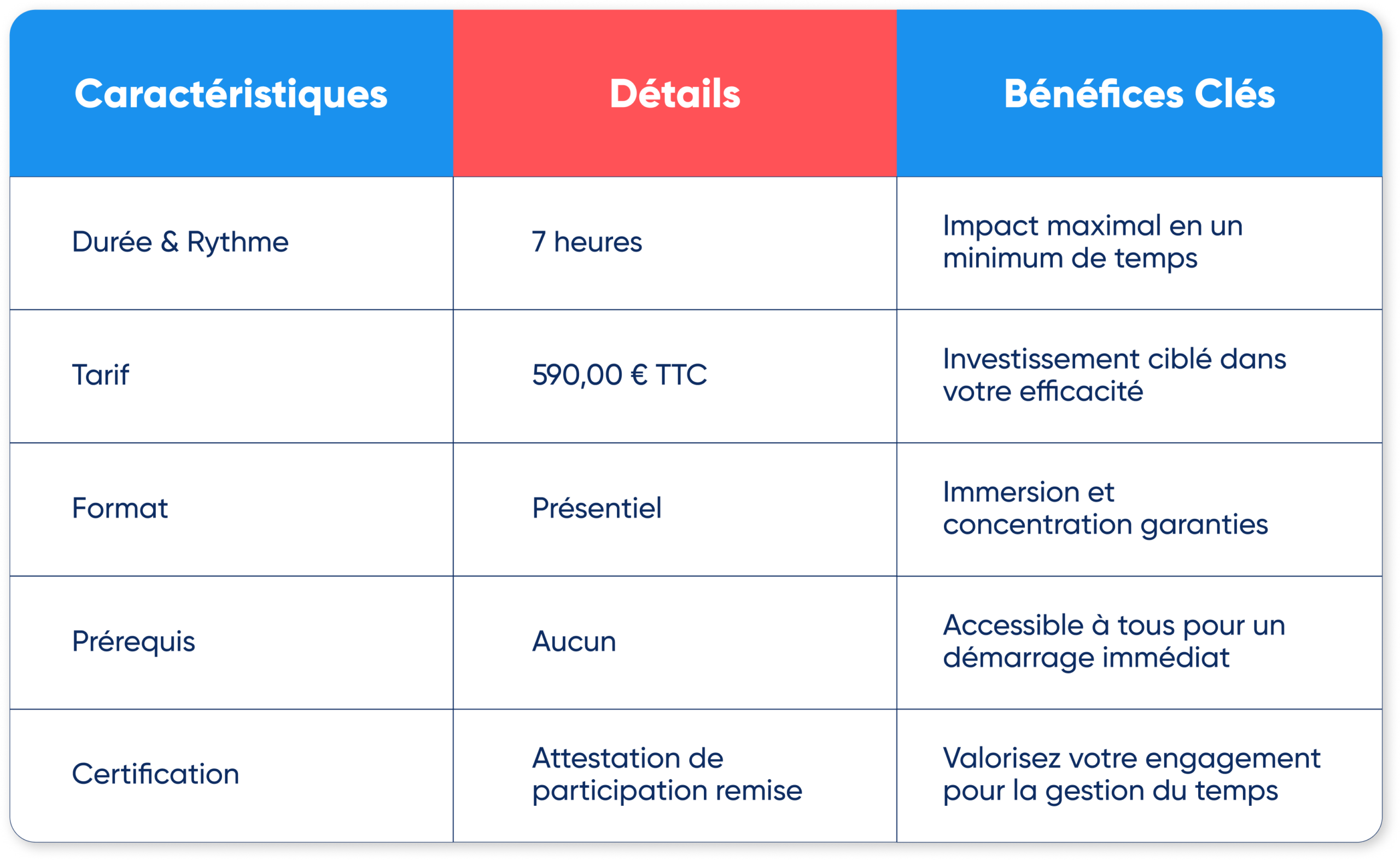 - Le format standard est le Présentiel (1 jour, 7 heures).